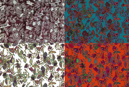 Digitally developed fabrics using hand drawn motifs and Pantone-living coral, color of the season